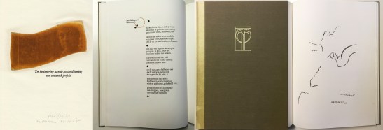 Bijgevoegd: Drukje (waarschijnlijk van Rob Cox) voor de medewerkers van deze uitgave: ‘Ter herinnering aan de totstandkoming/ van een uniek project’. Met in potlood ‘voor David/ Amsterdam 21-10-’85’. David is David Simaleavich, Meesterbinder van Binderij Phoenix en de uitgever van deze prachtuitgave.