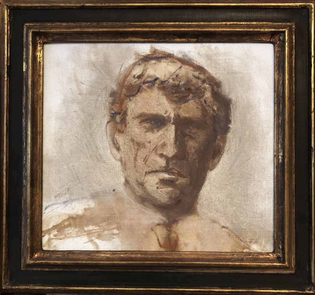 36. (REVE, Gerard). CALS, Joseph Portret van Gerard Reve. Olieverf op linnen, geplakt op hardboard. Beeldformaat 27 x 30 cm. Gesigneerd en gedateerd ‘Joseph Cals / November 1973’ op de achterzijde. Met een mooie lijst (buitenmaat 39 x 42 cm).
