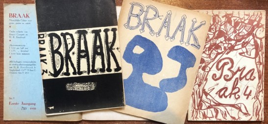 14. BRAAK 1-7. COMPLEET. (Maandelijks cahier voor proza, poëzie en critiek. Onder redactie van Remco Campert en Rudy Kousbroek (vanaf aflevering 3 ook Lucebert en Bert Schierbeek)). Jaargang 1, aflevering 1 tot en met 7 (1950-1951). Geniet (afl. 1 en 2) en ingenaaid (afl. 3-7; later naaigaren). (184) p. Aflevering 6 werd gestencild op groot papier. Pagina 137 en 164 zwak afgedrukt. Aflevering 7 is afkomstig van Gerrit Kouwenaar, met zijn handtekening op pagina 165.