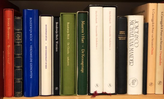 1. BROUWERS, Jeroen Bezonken rood. Amsterdam, De Arbeiderspers, (1981). Verguld halfmarokijn, de platten overtrokken met vezelig Japans papier in met marokijnen randen afgezet, stevig foedraal (Binderij Phoenix). (4), 136 p. 2e druk.