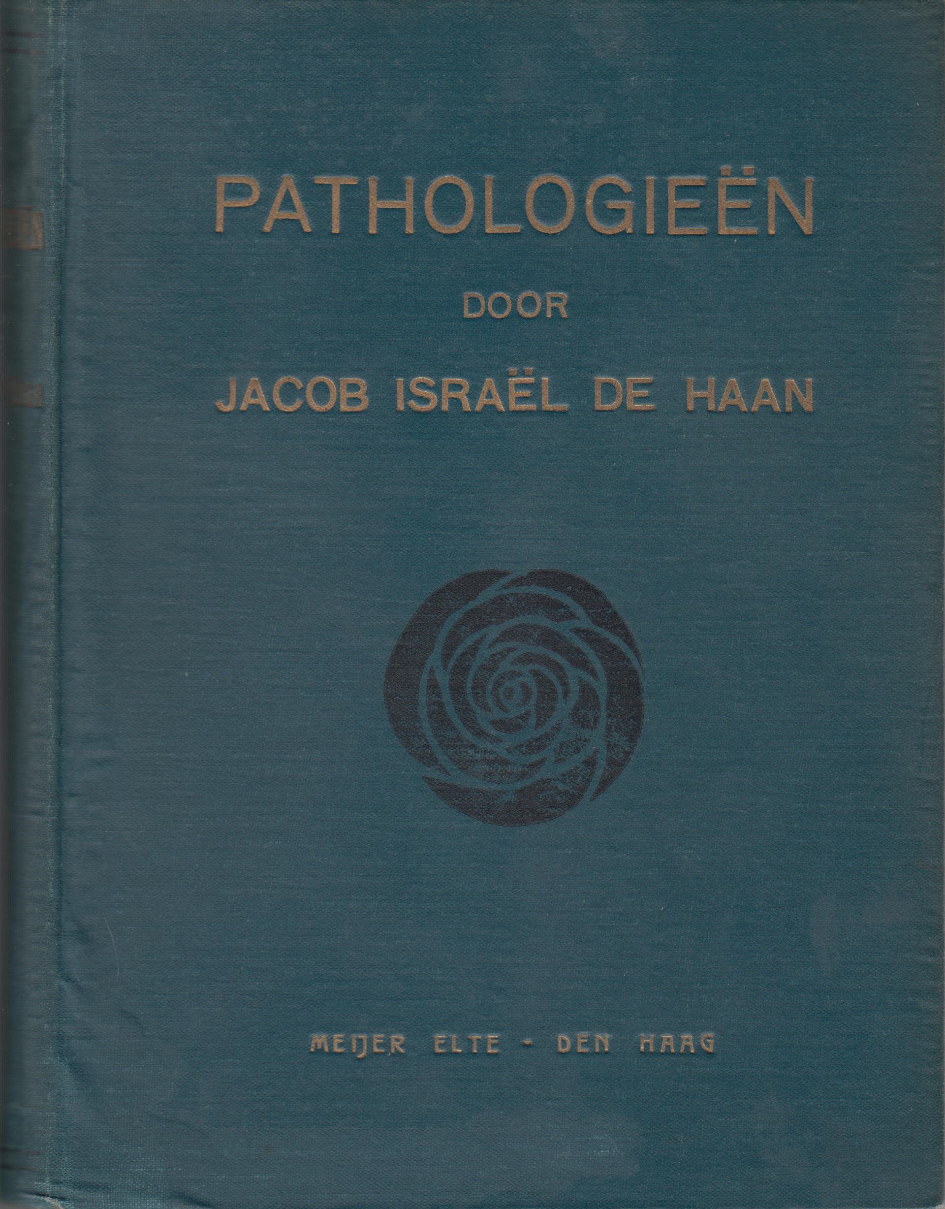 23. HAAN, Jacob Israël de Pathologieën. De ondergangen van Johan van Vere de With. (Met Een woord vooraf van de auteur). (Met eene voorrede van Georges Eekhoud). Rotterdam, Meindert Boogaerdt jun., 1908. Linnen. XVI, 320 p. Met het satanistische portret van De Haan als frontispice. 1e druk. Band vooral aan de achterkant met waterschade, bobbelig. Voorzijde deels dof.