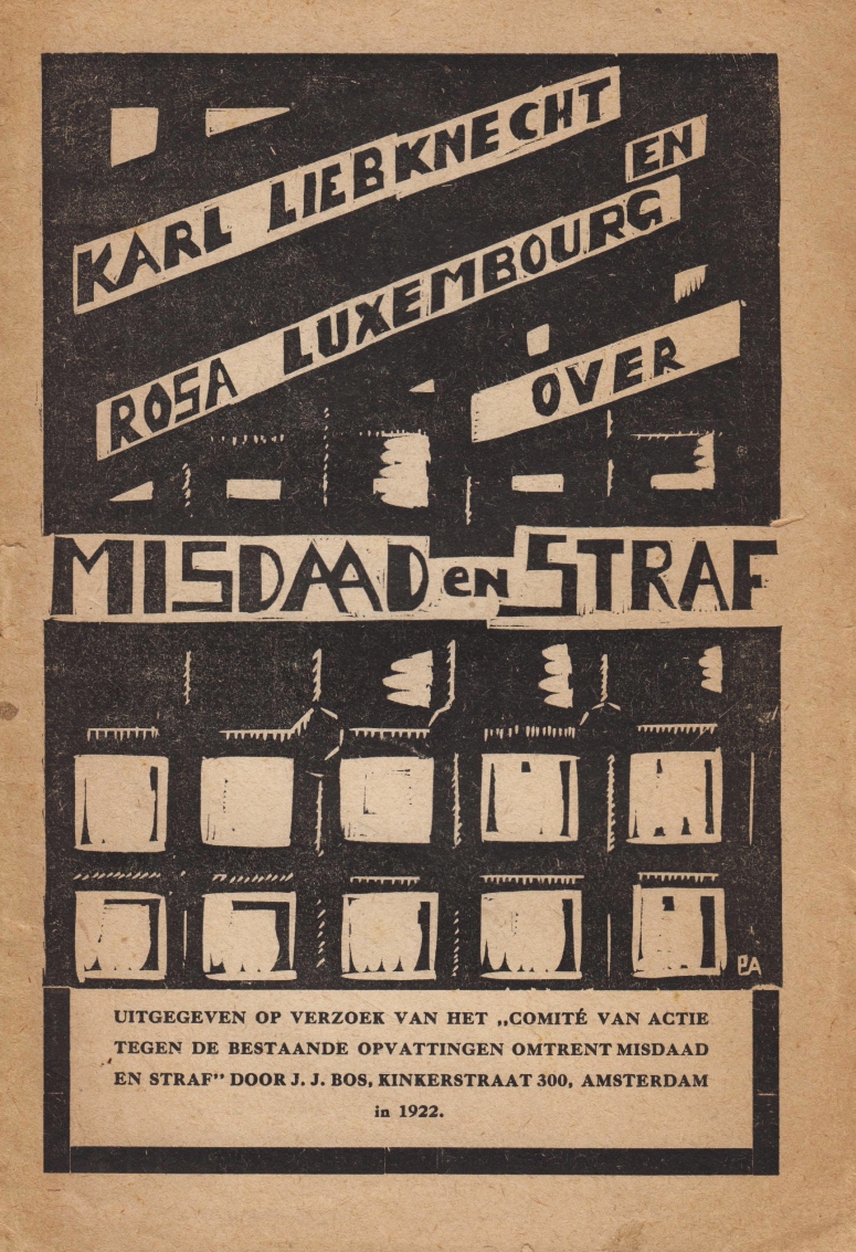 44. (WICHMANN, Clara) Karl Liebknecht en Rosa Luxemburg over misdaad en straf. Amsterdam, Uitgegeven op verzoek van het ‘Comité van Actie tegen de bestaande opvattingen omtrent Misdaad en Straf’ door J.J. Bos, 1922. Geniet. (12) p. 1e druk. Rugje en randen versleten, papier verbruind. Van het achterblad is een hoek afgescheurd (zonder tekstverlies).