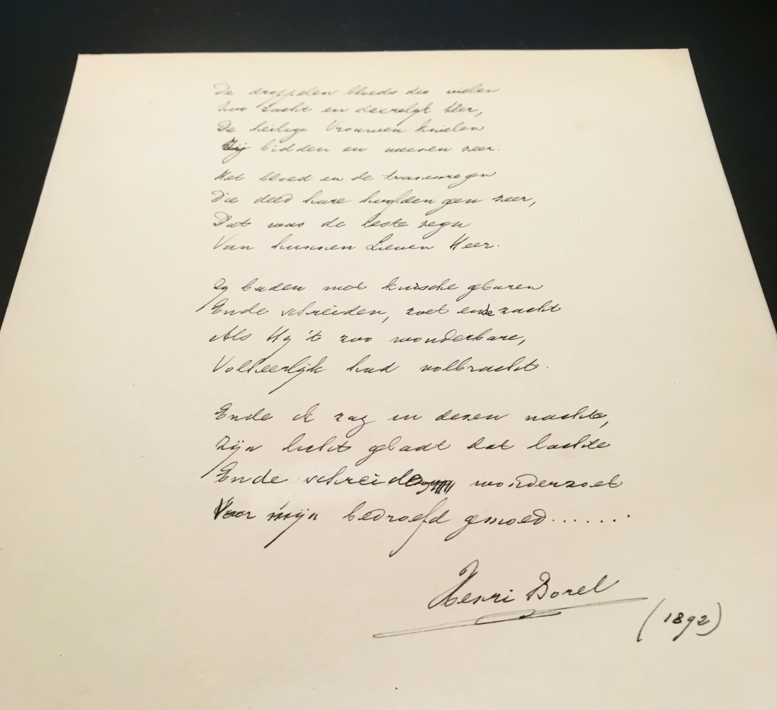 12. BOREL, Henri ‘Nachtvisioen’. (Gedicht in handschrift). Origineel handschrift in inkt geschreven op stevig papier. Recto en verso. 36 regels. Gedateerd ‘(1892)’, maar uitgeschreven voor een Rooms-katholieke missietentoonstelling in 1929.