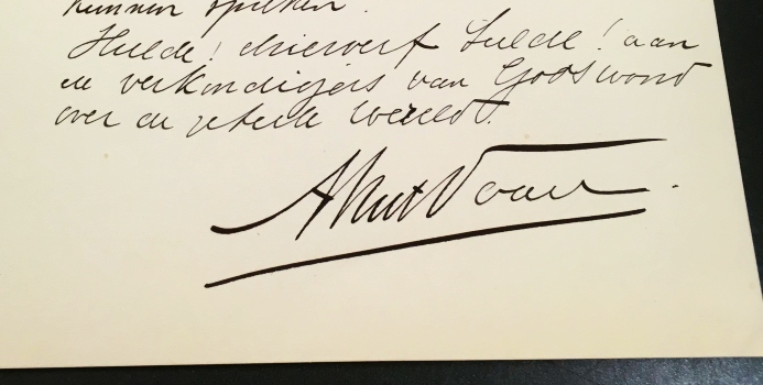 5. Mgr. A.H.L. Hensen (1854-1932), hoogleraar kerkgeschiedenis. 10 r. Citaat van de heilige Bonifatius als missionaris in Germanië, met inleiding. Getekend met zijn pauselijke eretitel als apostolisch protonotaris.