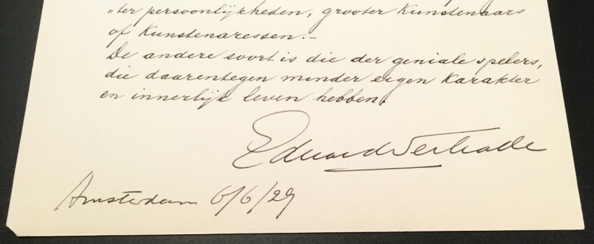 41. VERKADE, Eduard ‘Alle tooneelspel is in te deelen in twee groepen’. (Origineel handschrift, gesigneerd). Origineel handschrift in inkt geschreven op stevig papier. Alleen recto. 19 regels. Gedateerd ‘Amsterdam 6/6/29’. Uitgeschreven voor een Rooms-katholieke missietentoonstelling in 1929.