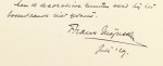 33. MIJNSSEN, Frans ‘Zonder beheersching geen kunst’. (Origineel handschrift, gesigneerd). Origineel handschrift in inkt geschreven op stevig papier. Alleen recto. 11 regels. Gedateerd ‘Juli ’29’. Uitgeschreven voor een Rooms-katholieke missietentoonstelling in 1929.