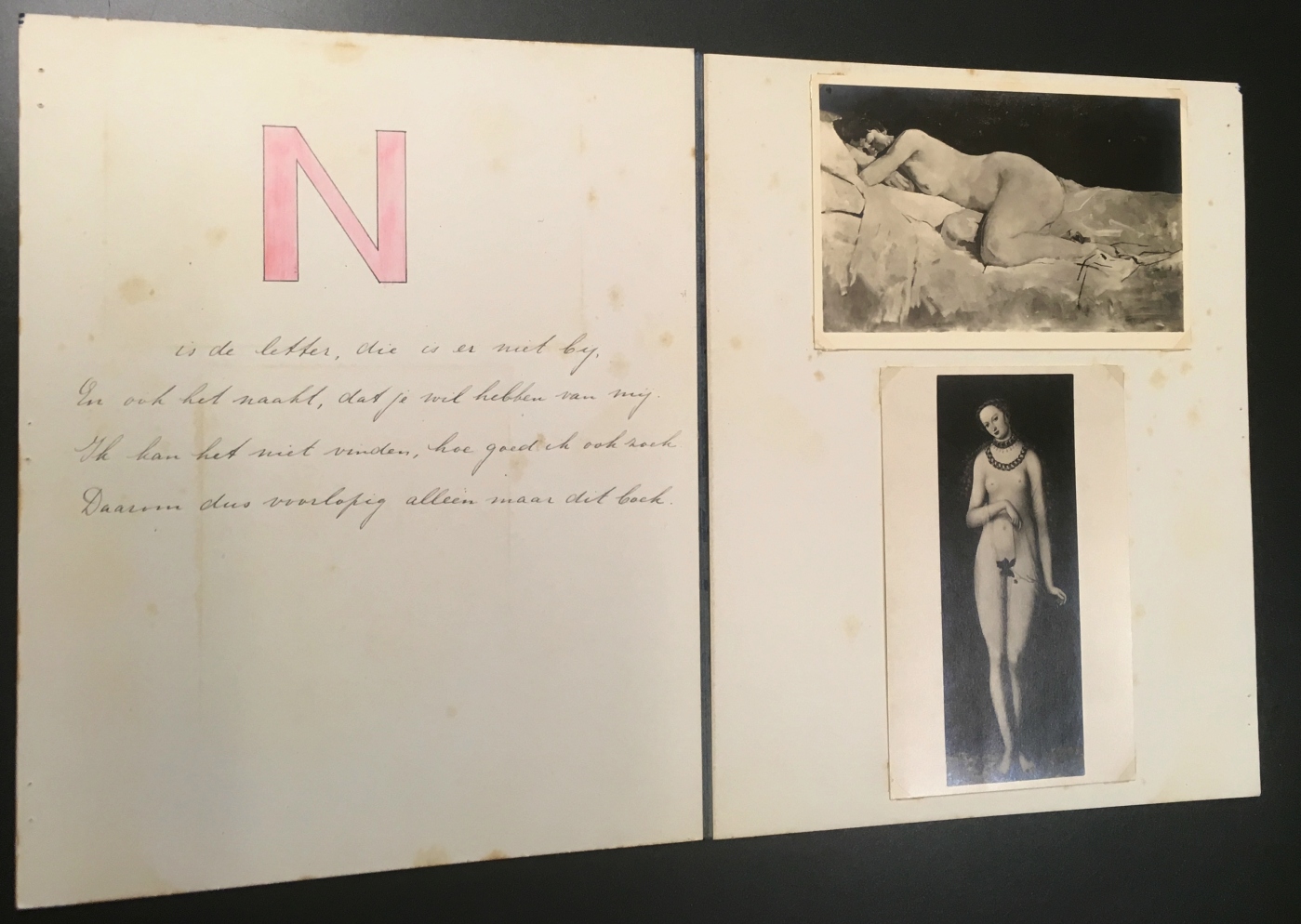 * Onthutsend anoniem ABC, gericht door de ongelukkige Geertruida aan haar geliefde, de met een ander getrouwde Cornelis. Je kunt alleen maar gissen naar het leed achter dit (Sinterklaas?)geschenk: ‘A is de aanpassing aan vele nare dingen/ B zijn de braven, die ons in alles dwingen/ C is Cornelis, die dit alles zo haat/ D is de deugd, die hem in boeien slaat. / E is het erge, dat we zo graag willen doen’. Maar: ‘N is de letter, die is er niet bij,/ En ook het naakt, dat je wil hebben van mij./ Ik kan het niet vinden, hoe goed ik ook zoek/ Daarom dus voorlopig alleen maar dit boek.’