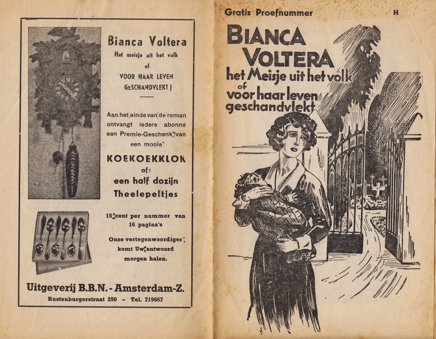 * Hoogst zeldzame prospectus voor een serie sentimentele pulpromans: ‘Aan het einde van de roman ontvangt iedere abonné een Premie-Geschenk van een mooie Koekoekklok of: een half dozijn Theelepeltjes. 15 cent per nummer van 16 pagina’s. Onze vertegenwoordiger komt Uw antwoord morgen halen.’