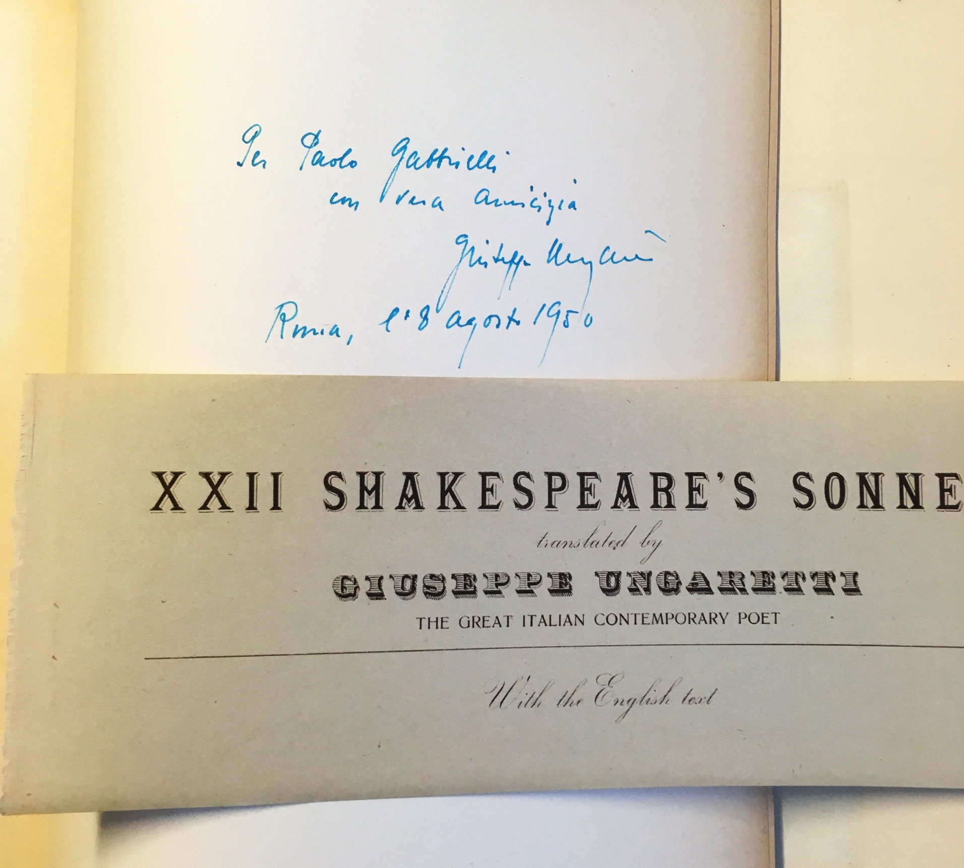 * Bijzonder boek verschenen in de oorlogsjaren, in groene inkt gesigneerd door de vertaler, de dichter Giuseppe Ungaretti, en ‘con vera amicizia’ opgedragen aan Paolo Gabbrielli, met datering ‘Roma, l’8 agost 1950’.