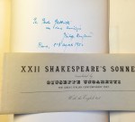 22. (UNGARETTI, Giuseppe). SHAKESPEARE, William XXII sonetti di Shakespeare scelti e tradotti da Giuseppe Ungaretti. (Met opdracht van Ungaretti). Rome, Documento, Editore Libraio, 1944. 34 x 25 cm. Halflinnen. Met gegraveerd portret als frontispice. Tweetalige editie (Engels en Italiaans). Gedrukt in 498 genummerde exemplaren. 1e druk. Het bedrukte deel van de buikband ligt los in het boek. Lichte slijtagesporen.