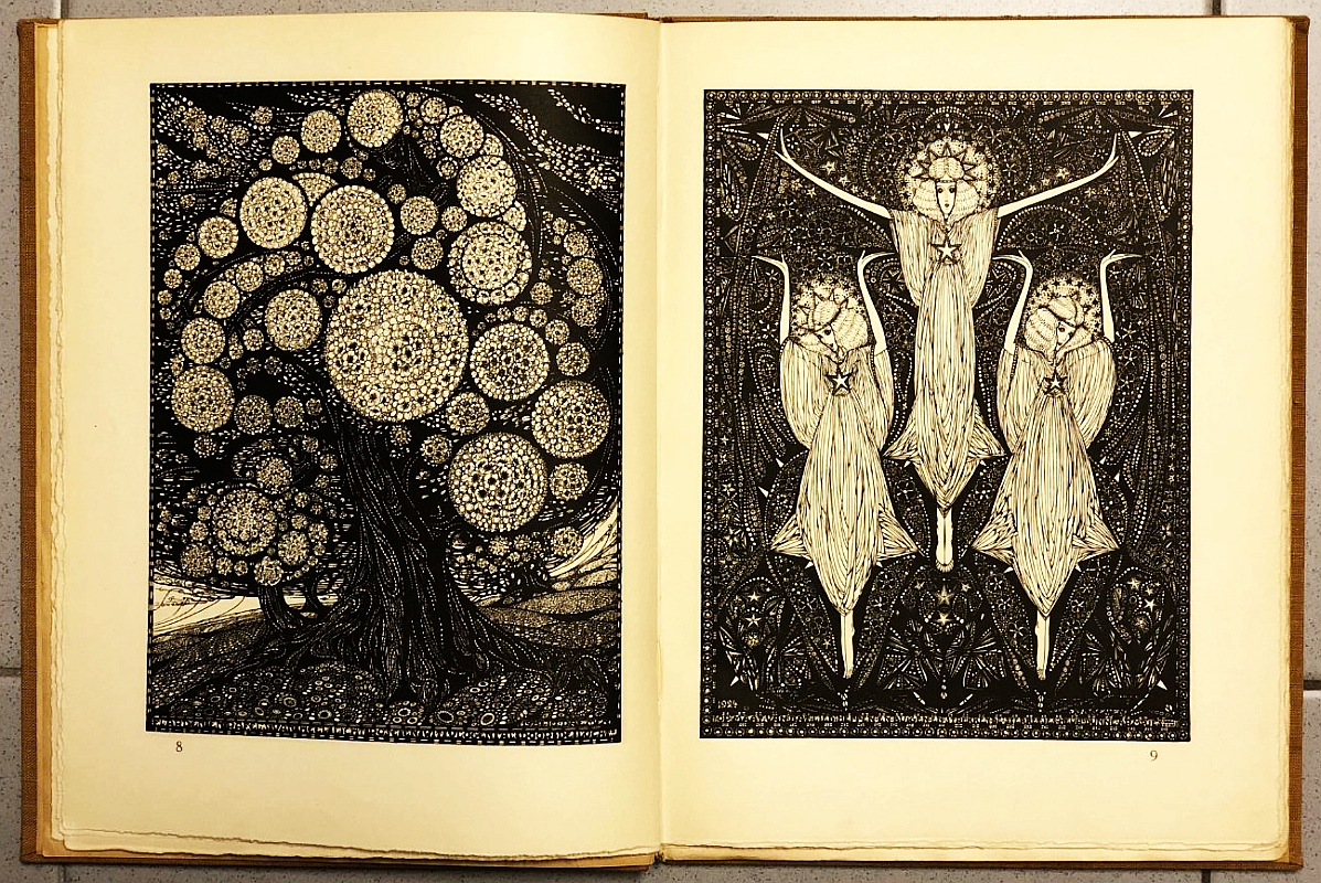 7. DAEMEN, Jo De heilige vlam. Het sprookje van Stefan Pártos. Rotterdam, Brusse, 1927. 32 x 25 cm. Verguld linnen. 56 p. Gezet uit de Erasmus van S.H. de Roos en gedrukt op geschept Van Gelder-papier in 700 genummerde exemplaren. Rijk versierd, alle pagina’s in decoratief kader. 1e druk. Lichte watervlek op de bovenkant van de band, die aan de zijkant ook heel licht verkleurd is. Schutbladen verbruind.