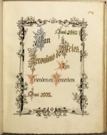 * 350 bekende en minder bekende Nederlanders feliciteerden de dichter, dominee en publicist Jeronimo de Vries (1838-1915) met zijn veertigjarig ambtsjubileum, hun namen werden netjes door Schmull op het geschepte papier getekend. Kundig versierd album door Johan Herman Schmull (1858-1912), kaarttekenaar van de Dienst Publieke Werken in Amsterdam, die vaker dergelijke albums maakte.