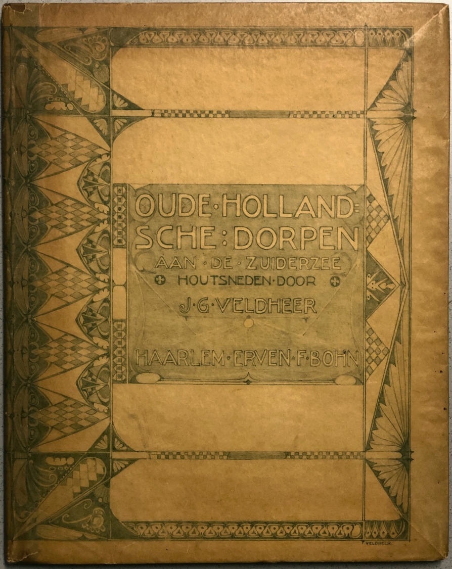 23. VELDHEER, J.G. Oude Hollandsche dorpen aan de Zuiderzee, door J.G. Veldheer. Tekst van W.J. Tuyn. Haarlem, Erven F. Bohn, 1900. 34 x 27 cm. Halflinnen band overtrokken met gedecoreerd perkaline. (8), 52 p. Titel in rood en zwart. Met 12 originele houtsneden (10 topographische gezichten, een frontispice met koggeschip; en een pagina in jugendstil-kader) van J.G. Veldheer, met initialen in rood. Tekst van Veldheer met W.J. Tuyn. 1e druk. Kwetsbaar omslag heeft enkele gaatjes in de rug, krasjes, achterop bruine vlekjes. Achterin is een merkje ingeplakt van boekhandel J.H. de Bois in Haarlem (ca. 1920).