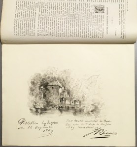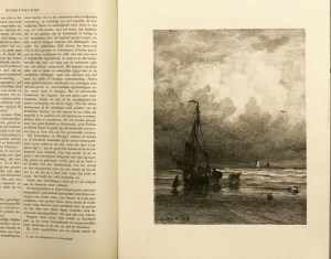 18. MESDAG, H.W. Lithografie met visserboot bij het strand. In: Kunstkronijk, aflevering 21 en 22, 1875. Leiden, Sijthoff, 1875. 35 x 27 cm. Origineel omslag. 8 p. tekst genummerd 81-88, met een litho van Mesdag, door hemzelf op de steen getekend. In de plaat gesigneerd (in spiegelbeeld). Ook met een reproductie van een prent van Albrecht Dürer (Maria en Jozef met Jezus op weg naar Egypte). 1e druk. Zeer goede conditie.