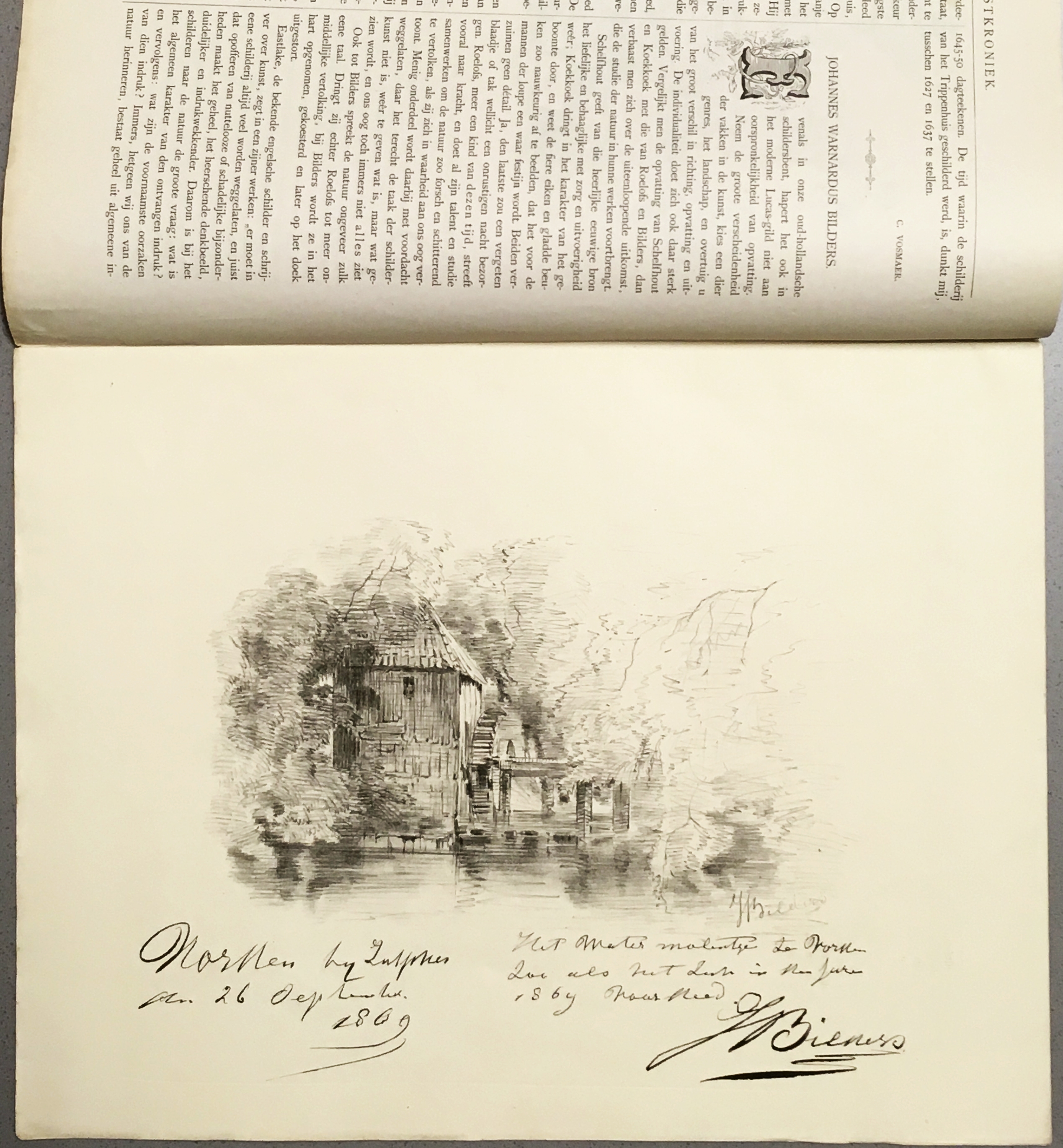 2. (BILDERS, J.W.) Lithografie met afbeelding van een watermolen bij Vorden. In: Kunstkroniek, aflevering 1 en 2, 1876. Leiden, Sijthoff, 1875. 35 x 27 cm. Origineel omslag. 8 p. tekst genummerd 1-8, met een litho van J.W. Bilders, op de steen getekend en gesigneerd (tweemaal). Ook met een reproductie in diepdruk van een schilderij van Frans Hals (lachende luitspeler). 1e druk. De Frans Hals-reproductie is flink roestvlekkig, verder is het tijdschrift gaaf en fris.