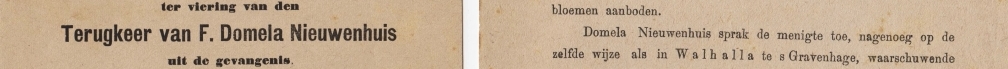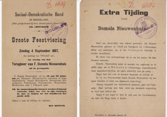 * De socialistisch-anarchistische pionier Ferdinand Domela Nieuwenhuis (1846-1919) werd begin 1887 veroordeeld tot een jaar gevangenisstraf wegens majesteitsschennis. Op 31 augustus van dat jaar werd hij vervroegd vrijgelaten. Dat leidde tot een triomftocht door Nederland. Op 4 september werd hij in Amsterdam verwelkomd, waarvan deze twee buitengewoon efemere, kwetsbare pamfletjes tastbare getuigen zijn.