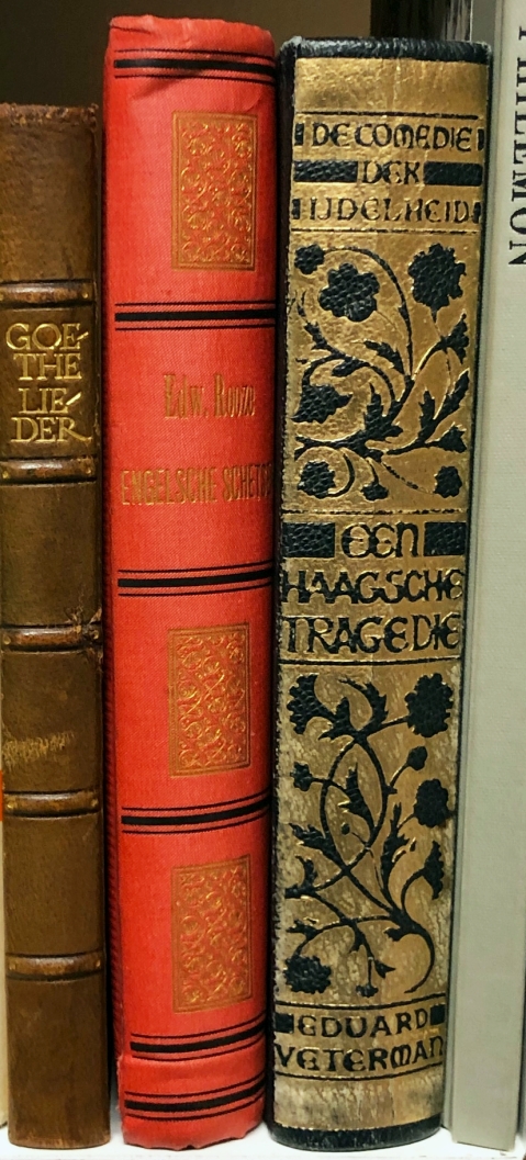 * Dit is nr. V van 20 Romeins genummerde luxe-exemplaren, van een gesigneerde oplage van 1000. Niet alle 20 zijn zo luxueus gebonden, zoals dit. Een echte Haagse roman (dank, Arno Kuipers)!
