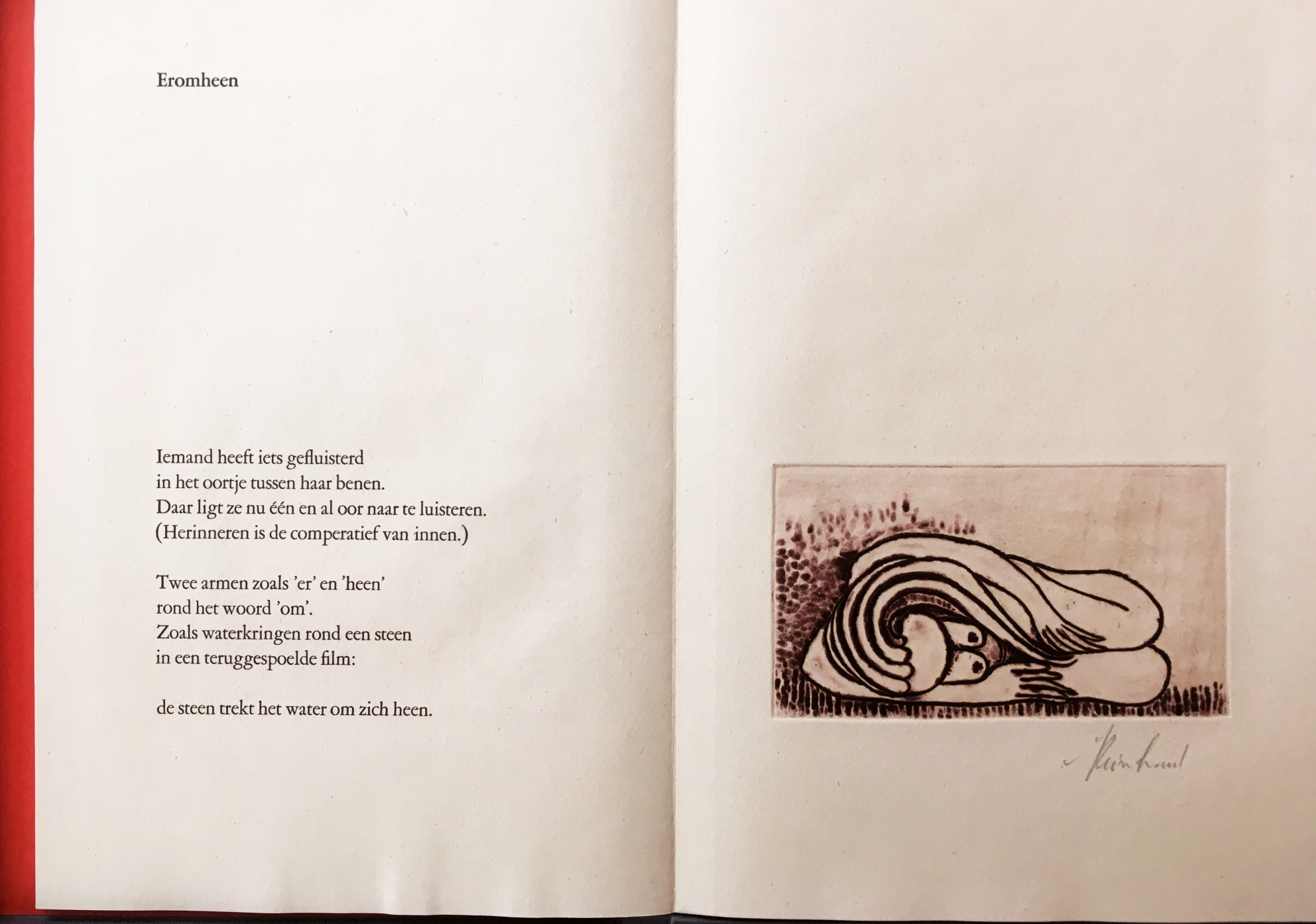 14. CONINCK, Herman de, en REINHOUD Meisjes. (Met zes originele, gesigneerde kleurenetsen door Reinhoud). [Amstelveen], AMO, 1994. Leporello in linnen overslagdoos (39,8 x 26,1 cm; Binderij Phoenix). Met de hand gezet uit de Garamond en gedrukt door Rob Cox op Hahnemühle in rood en zwart in een oplage van 31 genummerde en door auteur en kunstenaar gesigneerde exemplaren. 1e druk. Miniem deukje in achterzijde overslagdoos.