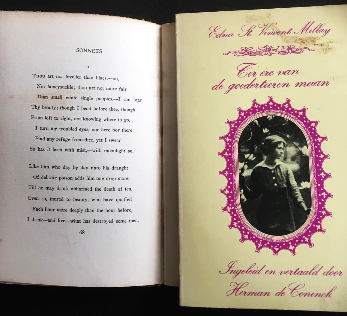 2. (CONINCK (vert.), Herman de). Edna St. VINCENT MILLAY Ter ere van de goedertieren maan. Ingeleid en vertaald door Herman de Coninck. Brugge/ Nijmegen, Orion/ Gottmer, (1979). Ingenaaid. 48 p. 1e druk.