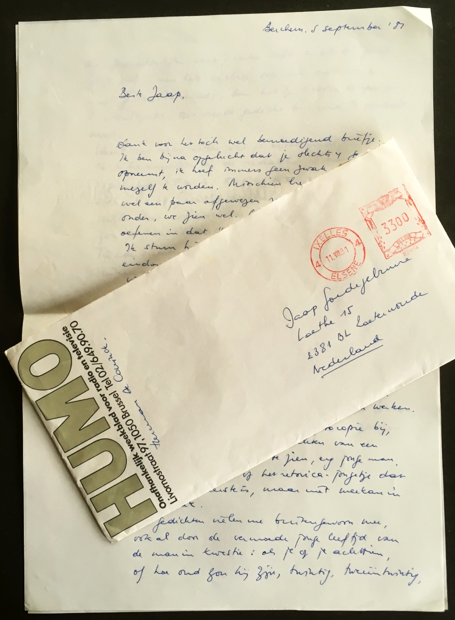5. Handgeschreven brief aan ‘Beste Jaap’. Twee bladen. Alleen recto. Gesigneerd ‘Herman’ en gedateerd ‘Berchem, 12 oktober ’81’. 56 regels tekst. Met originele envelop.