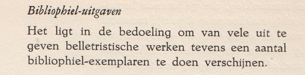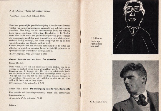 * Inhoudsrijke prospectus voor de ‘Litteratuur der jongeren’ van De Bezige Bij, met aandacht voor en foto’s van Harry Mulisch (Archibald Strohalm), Hugo Claus (De hondsdagen), Adriaan Morriën, Bert Schierbeek (Het boek IK), Jan Vrijman, J.B. Charles (geen foto maar een tekening door zijn zevenjarige zoon), G.K. van het Reve (o.a. De Avonden, maar zie de afbeelding), Remco Campert (met gedicht), Jan G. Elburg, Bert Voeten, Koos Schuur en Victor van Vriesland.