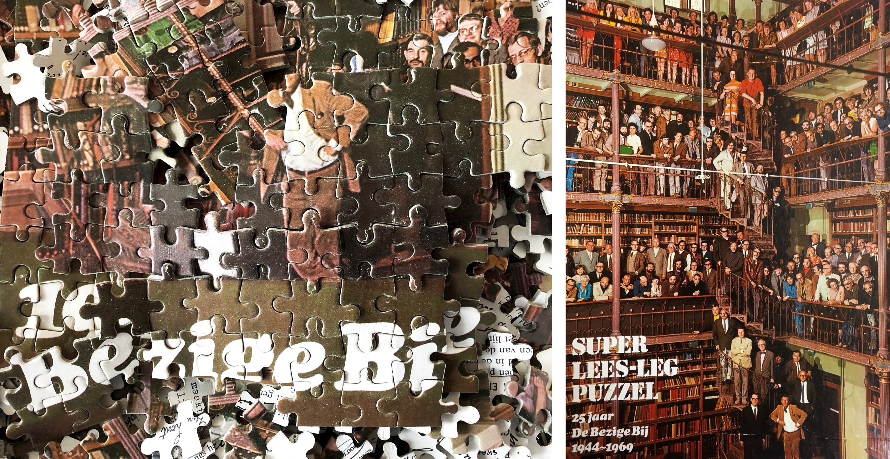 1. BEZIGE BIJ, De Super lees-leg puzzel. 25 jaar De Bezige Bij 1944-1969. Puzzel van de beroemde foto van Paul Huf met daarop (bijna) alle fondsauteurs, genomen in de bibliotheek van het Rijksprentenkabinet in het Amsterdamse Rijksmuseum op 15 mei 1969.