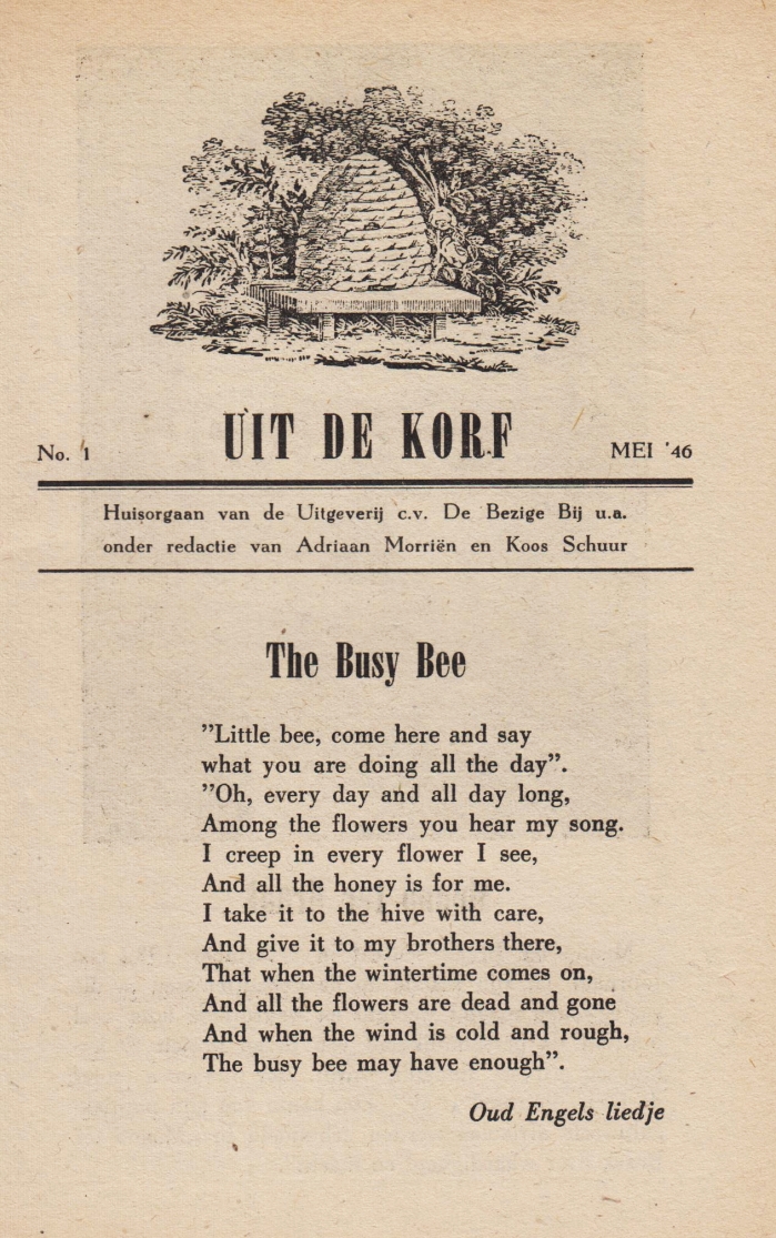 * De afleveringen 1-3, 5-6 en 9 van dit zeldzame ‘Huisorgaan van de c.v. De Bezige Bij’ met artikelen, aanbiedingen, nieuwtjes, cartoons en prijsvragen. Bevat bijdragen van S. Carmiggelt, Ida Gerhardt, Adriaan Morriën (o.a. over uitgeverij Het Zwarte Schaap), Annie M.G. Schmidt, Koos Schuur en Bert Voeten. Aflevering 5 bevat een meer dan paginagroot artikel over De Avonden (‘De roman waarop men wachtte’) door Koos Schuur, aflevering 8 bevat een uitgebreid artikel van Hans Redeker ‘Over het “negativisme” in de moderne literatuur’.