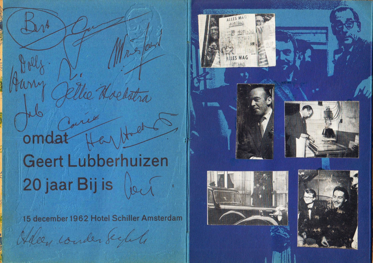 * Leuke menu-uitgave van het diner, gehouden op 15 december 1962 in Hotel Schiller in Amsterdam. Met achttien moeilijk leesbare (gelegenheids)handtekeningen, waaruit we in ieder geval Han G. Hoekstra, Adriaan Morriën, Harry Mulisch, W.H. Nagel, Bert Schierbeek en Victor van Vriesland kunnen distilleren. Op de foto’s zien we behalve Lubberhuizen ook Remco Campert, J.B. Charles, Koningin Juliana, Lucebert en Bert Schierbeek. Mooi menu trouwens, met onder andere kreeft, zwezerik en geroosterde fazant.