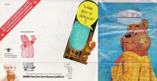 * Het ‘behangselboek’ op groot formaat Met uw welnemen met bijbehorende boekhandelsfolder Bombarie rond de nieuwe Bommel en twee inliggende stencils (1973), het grote affiche ‘10.000 x Tom Poes’ met bijbehorend stencil (3 bladen) voor de boekhandel, een met ‘Bommelactie 1983’ bedrukte envelop waarin twee folders en bestelkaart, en een idem met ‘Wat doet de Bezige Bij naast het Boekenweekgeschenk (…)’ uit 1982; de boeken Heer Bommel als theoretisch econoom van A. Heertje (1978), De nullijn in de economische praktijk van O.B. Bommel (1978), Als dat maar goed gaat (linnen met stofomslag), Een Heer in de kracht van zijn leven (genummerde oplage, nr. 0887, de boekenlegger ‘Waar ben ik gebleven?’, de NBLC-uitgave ‘Over Marten Toonder’ (1982), zes luxe uitgevoerde aan Bommel en Toonder gewijde boekhandelsfolders, een Thomas-Rap-voorjaarsaanbieding waarin Bommel-kaarten worden aangeboden, de Toonderkrant (2012), en een plastic tas met afbeelding van Heer Bommel. Bijgevoegd: enkele duplicaten.