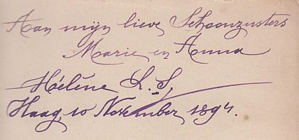 * Exemplaar met handgeschreven opdracht van de schrijfster op Franse titel: ‘Aan mijn lieve Schoonzusters/ Marie en Anna/ Hélène L.S./ Den Haag, 10 November 1894’.