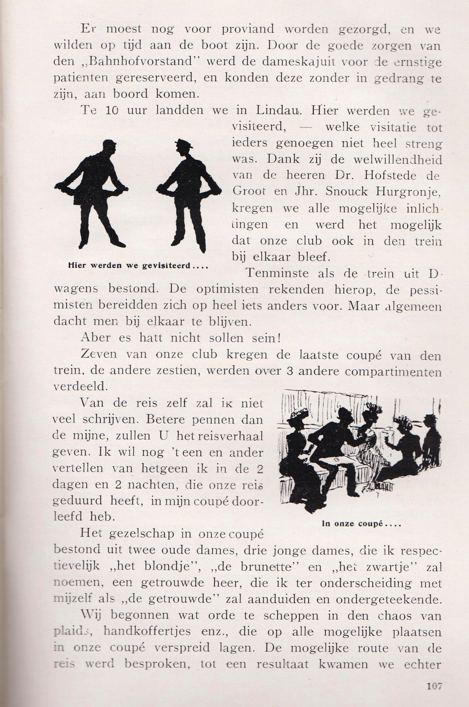 * Privé-uitgave met een 35-tal verslagen van de terugtocht uit Zwitserland van bij het uitbreken van de Eerste Wereldoorlog gestrande Nederlandse reizigers, ‘voor hunne medereizigers op papier gesteld’. De bijdragen lopen nogal uiteen, van aangrijpend via feitelijk en gedetailleerd tot zelfs een vrolijke meezinger ter ere van het Stoomschip Bandoeng! Met bijdragen van de theoloog prof. H.Y. Groenewegen, de medici prof. R.H. Saltet en prof. E.C. van Leersum, oud-minister-president Th. Heemskerk, het Eerste-Kamerlid C.C. Geertsema, de kinderboekenschrijfster Christine Doorman, Dr. M.J. Baale (de eerste vrouw in West-Europa die promoveerde in de klassieke talen), de fotograaf C.A.P. Ivens en vele anderen. Met foto’s (o.a. door Ivens) en tekeningen.