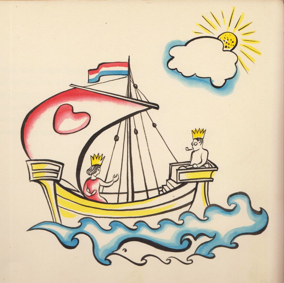18. FRANQUINET, Robert Uchtend verzen. Eigenhandig geïllustreerd door René Smeets. Aangeboden aan Hare Koninklijke Hoogheid Prinses Juliana bij gelegenheid van Haar huwelijk met Zijne Doorluchtige Hoogheid Prins Bernhard von Lippe Biesterfeld. (Beek), eigen beheer, 1936. Oblong 20 x 30 cm. Spiraalband. 19 bladen. Met twee originele kleurentekeningen van René Smeets. Gedrukt in slechts 10 genummerde exemplaren, alle gesigneerd. De nummers 1 en 2 werden aan de Koninklijke Familie aangeboden. 1e druk. Deel van spiraaltje ontbreekt, wat vlekjes, bibliotheekzegeltje op achterkant en paars stempel op de titel van het karmelietenklooster te Geleen.