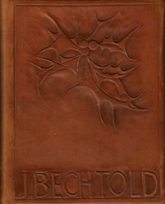* Speciaal exemplaar vervaardigd in geciseleerd leer, ‘frappé et repoussé’, een techniek waar het boekbindatelier van Ernest van Aelst en zijn dochter Justine in gespecialiseerd was. Met zijn broer had de Maastrichtenaar Ernest van Aelst (1884-1944) een drukkerij-uitgeverij. Zelf bezat hij een grote verzameling oude boeken. Dit boekje is voorin voorzien van een speciaal gedrukte bladzijde, in druk gedateerd ’23 Mei 1939′, gesigneerd door Van Aelst, waaruit blijkt dat het vervaardigd werd voor J. Bechtold, de hoofdredacteur van de Nieuwe Venlosche Courant. Voorop is een hulsttak in het leer uitgevoerd boven de naam ‘J. Bechtold’, en achterop een wapenschild: een leeuw boven een anker. Een mooi Maastrichts unicum!