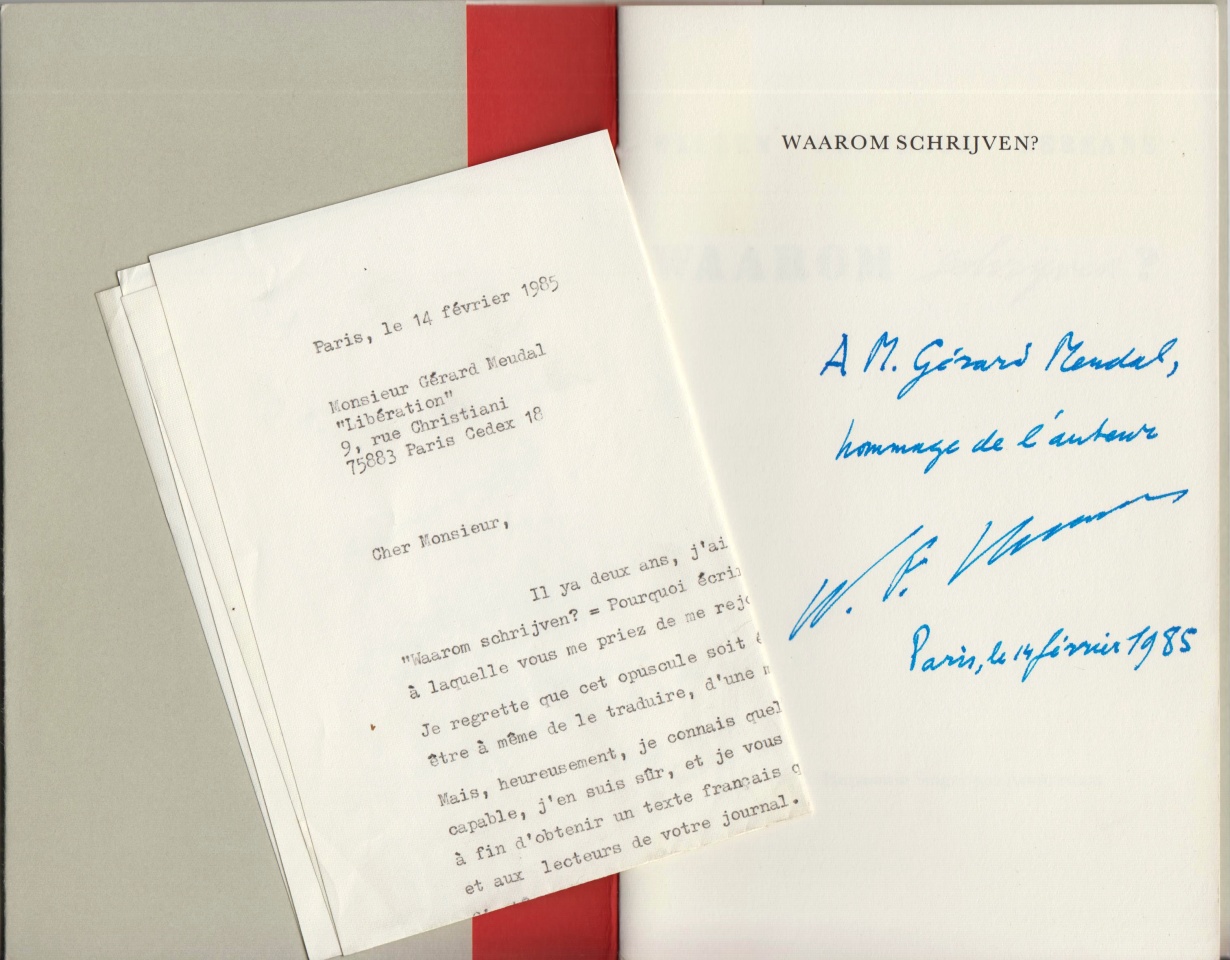 Bijgevoegd: getypte brief aan ‘Cher Monsieur (Meudal)’. Eén blad. Alleen recto. Op eigen briefpapier (‘Avenue Niel’). Gesigneerd ‘W.F. Hermans’ en gedateerd ‘Paris, le 14 février 1985’. 17 regels tekst. Tweemaal gevouwen.
