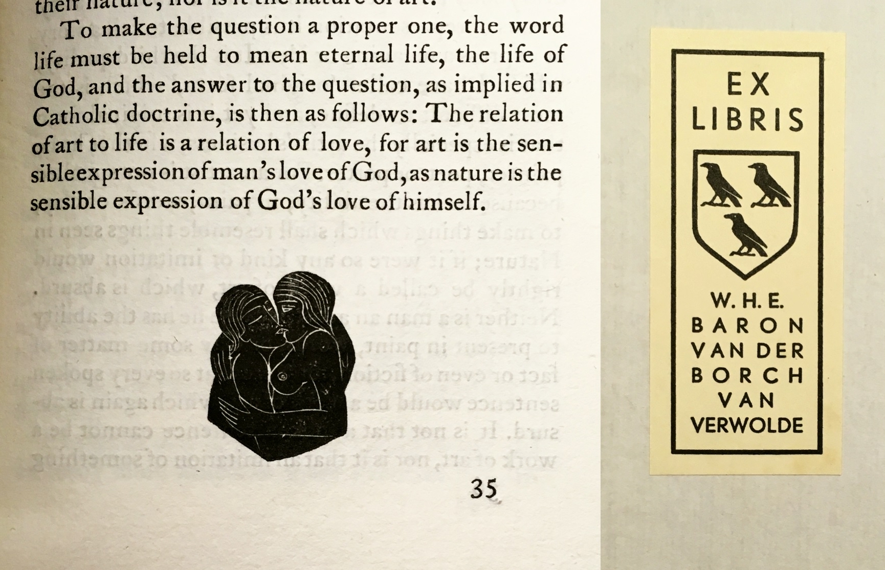 9. (BORCH VAN VERWOLDE, Emile van der). GILL, Eric Christianity and Art. Abergavenny, Francis Walterson, 1927. Linnen (buckram). Foedraal, met lederranden afgezet. (12), 48 p. Met een paginagrote houtgravure van David Jones en twee vignetten in houtgravure van Eric Gill. Gedrukt bij de Shakespeare Head Press in 200 genummerde exemplaren op handgeschept papier, alle gesigneerd door Eric Gill en David Jones. 1e uitgave in boekvorm. Rug wat verbleekt. Naaisel binnenin zichtbaar bij p. 1.