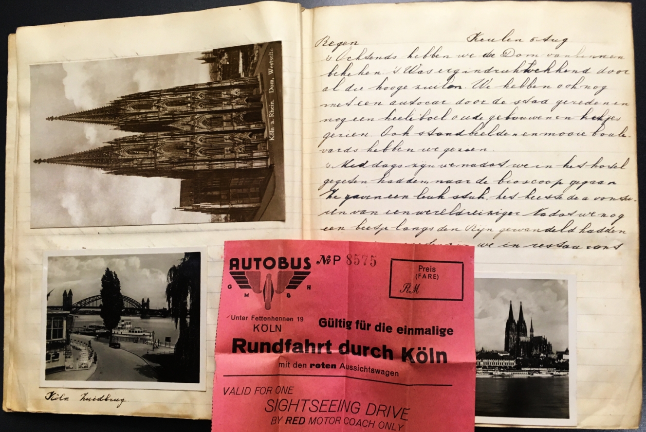 8. (BOEKHANDEL VAN STOCKUM). KERLING, L. Een reisje langs den Rijn. 4 Aug – 18 Aug. 1928. Gelinieerd schoolschrift met linnen rug. 27 bladen gebruikt. Handgeschreven tekst en vele ingeplakte foto’s, ansichten, kaartjes en andere drukwerken. Wat roest.