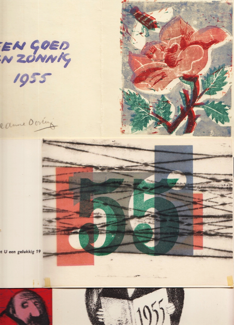 2. (BESTE WENSEN). BIERUMA OOSTING, Jeanne, & Metten KOORNSTRA, Gerrit van ’t NET en Otto TREUMANN Beste wensen voor 1955. Zes zelf ontworpen nieuwjaarswensen van verschillende kunstenaars voor D.A.M. Binnendijk.
