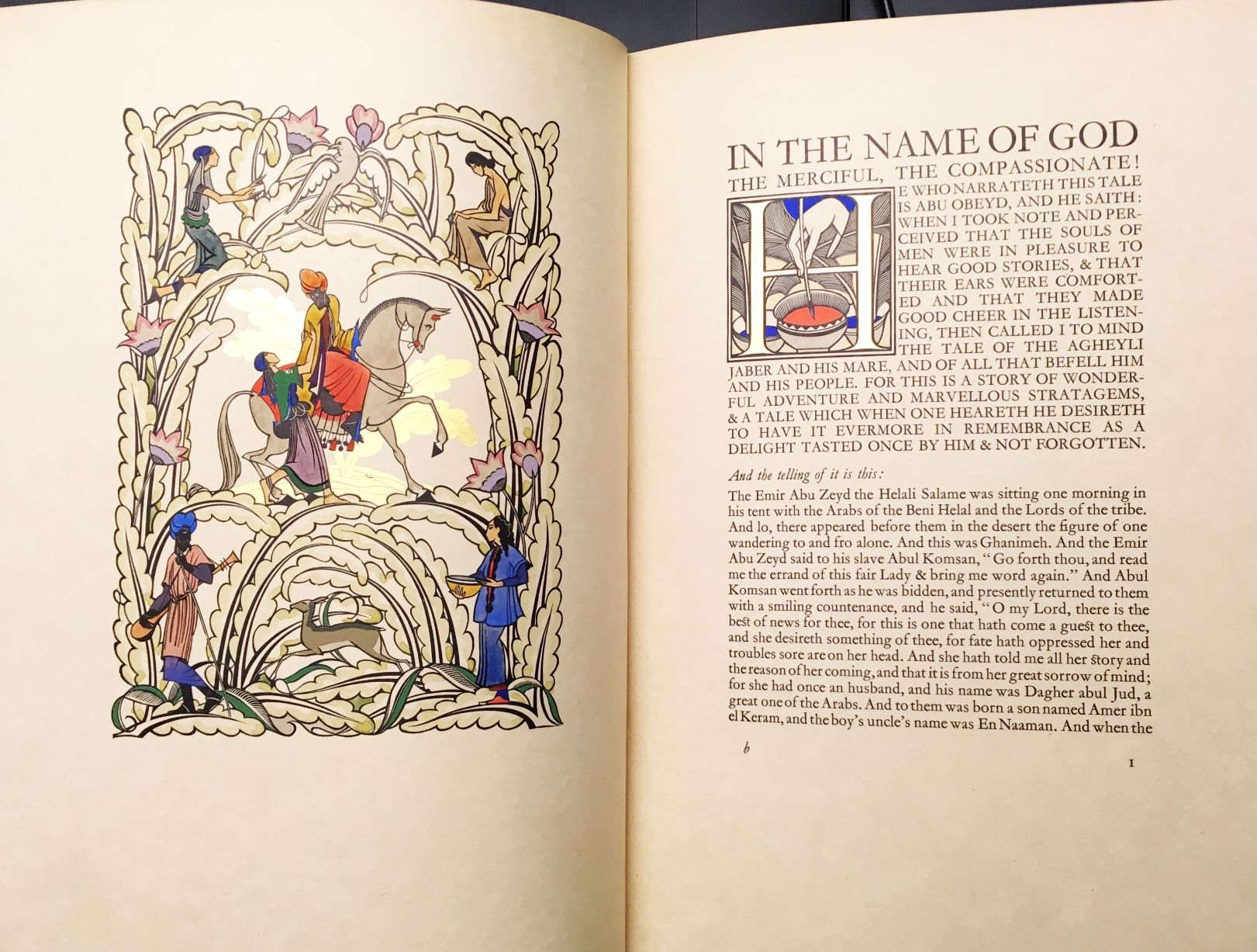 * Een tiende-eeuwse Arabische tekst uit Egypte, vertaald in het Engels door het excentrieke, paarden fokkende upper-class-paar Wilfrid Scawen en Anne Blunt. Beiden waren al ongeveer tien jaar overleden vóór de totstandkoming van dit uiterst aantrekkelijke boek in groot en breed kwartoformaat. Met een oogverblindende paginagrote in hout gegraveerde art-deco-afbeelding door Robert Ashwin Maynard en 13 initialen (waarvan 12 verschillende, allemaal even aanbiddelijke A’s) die hoogst subtiel met de hand werden ingekleurd, en een verguld uitgeversmerk op de titel.