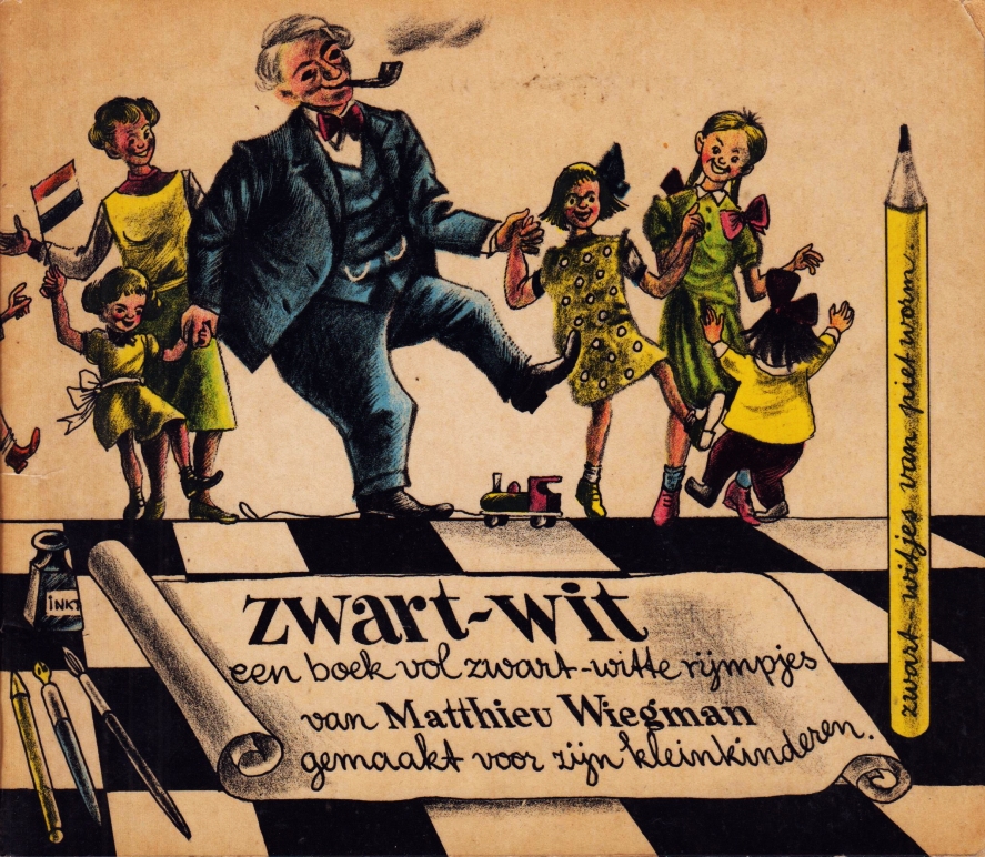 39. WIEGMAN, Matthieu Roetzwart sneeuw-wit. Een kunstschilder rijmt in zwart en wit en Piet Worm tekende de zwart-witte prentjes. Zonder plaats of uitgever, [1952]. Kleurig omslag van Piet Worm. (28) p. 1e druk.