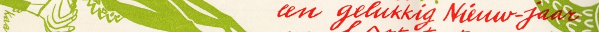 1. ASSER, Eli, & Hugh JANS: Vouwkaart met tekening in groen en tekst in rood: ‘Eli Asser en Hugh Jans geven hierbij kennis van het feit dat zij voor het eerst van hun leven een échte kaart hebben laten drukken om U een gelukkig Nieuw-jaar van harte toe te wensen’! Niet gesigneerd.