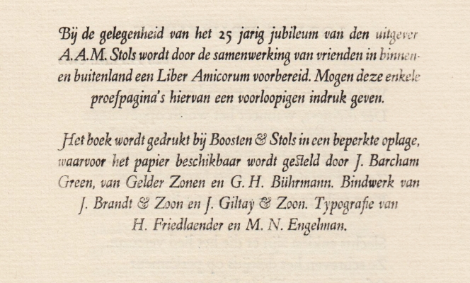 Deze proef bevat drie gedichten, van P.N. van Eyck, Pierre Kemp en Jan van Nijlen. Uit het colofon: ‘Bij de gelegenheid van het 25 jarig jubileum van de uitgever A.A.M. Stols wordt door de samenwerking van vrienden in binnen- en buitenland een Liber Amicorum voorbereid. Mogen deze enkele proefpagina’s hiervan een voorloopigen indruk geven’. Niet in de NCC.