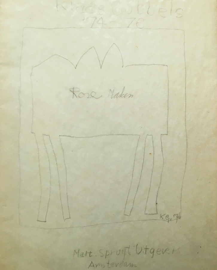 * Zeer bijzonder exemplaar: niet alleen tekende de kunstenaar een paginagrote tafel in potlood op het voorste schutblad (gesigneerd en gedateerd ’76 / K. Gubbels’), ook is dit exemplaar voorzien van een omslag van doorzichtig vliegerpapier, waarop de kunstenaar in potlood precies het stofomslag van de handelsuitgave heeft nagetekend en geschreven. In de tafel schreef hij ‘Roze Maken’; het enige verschil met het stofomslag is dat hij deze tekening monogrammeerde: ‘KG, 76’.