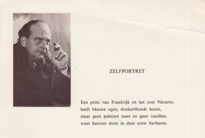 7. BOURBON, Louis de Zelfportret. [Doorwerth? eigen beheer, 1973 of 1974?]. 29 x 20 cm. Planodruk op glanzend papier met portretje van de (gekwelde, rokende) dichter. Vouw.