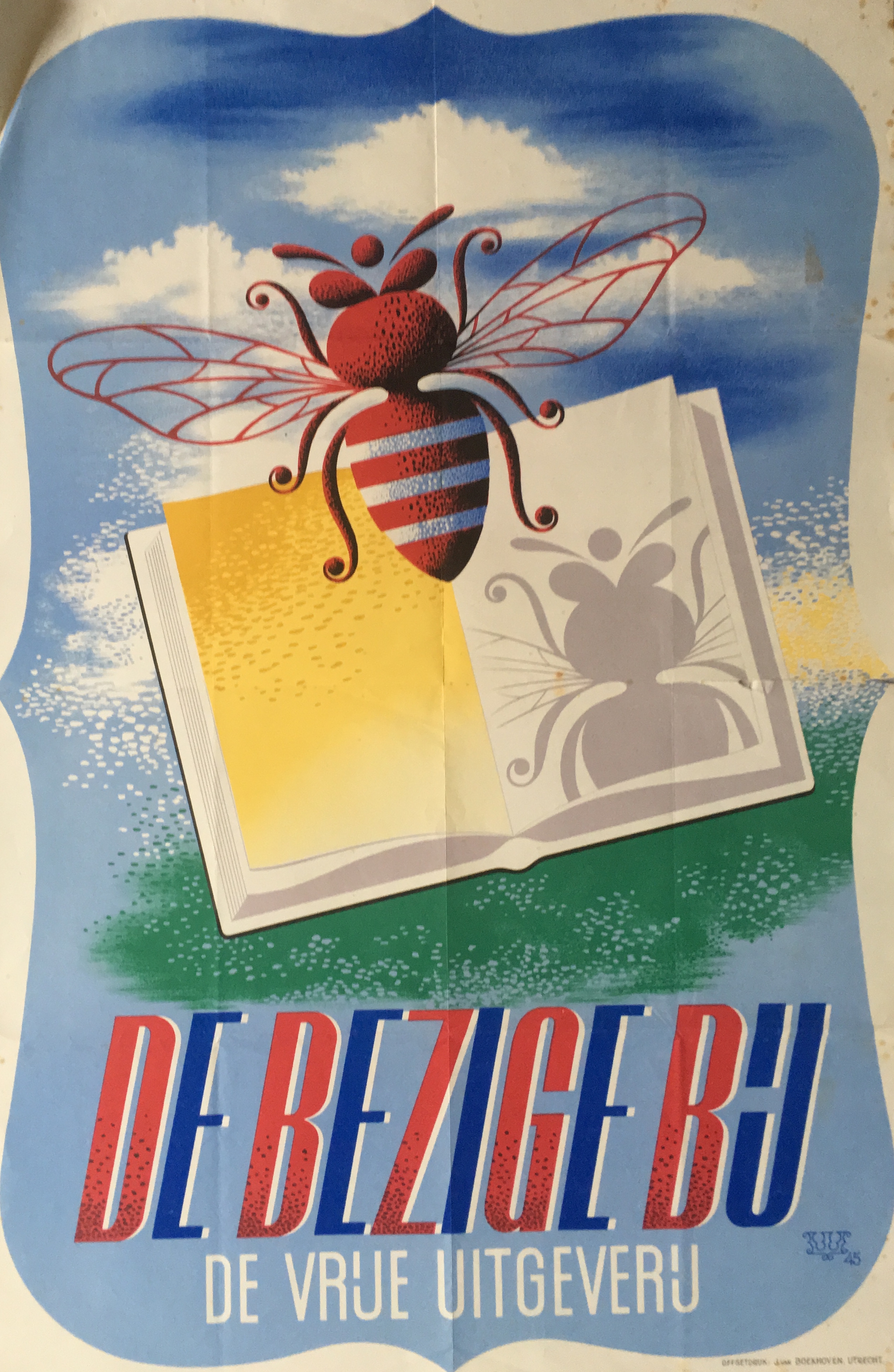 11. (DE BEZIGE BIJ) De Bezige Bij. De vrije uitgeverij. Affiche. 1945. 64,5 x 43,0 cm. Gedrukt door J. van Boekhoven in Utrecht. Viermaal gevouwen (geweest), scheur van ca. 12 cm. op een vouw, wat roest.