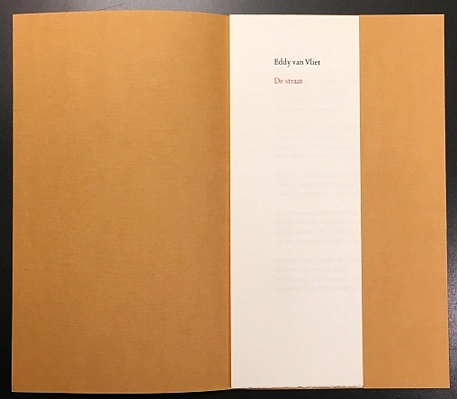15. VLIET, Eddy van De straat. (Den Haag, Mikado Pers, 1989). Vouwblad in omslag. Met de hand gezet en gedrukt in rood en zwart in een oplage van 90 exemplaren. 1e druk.