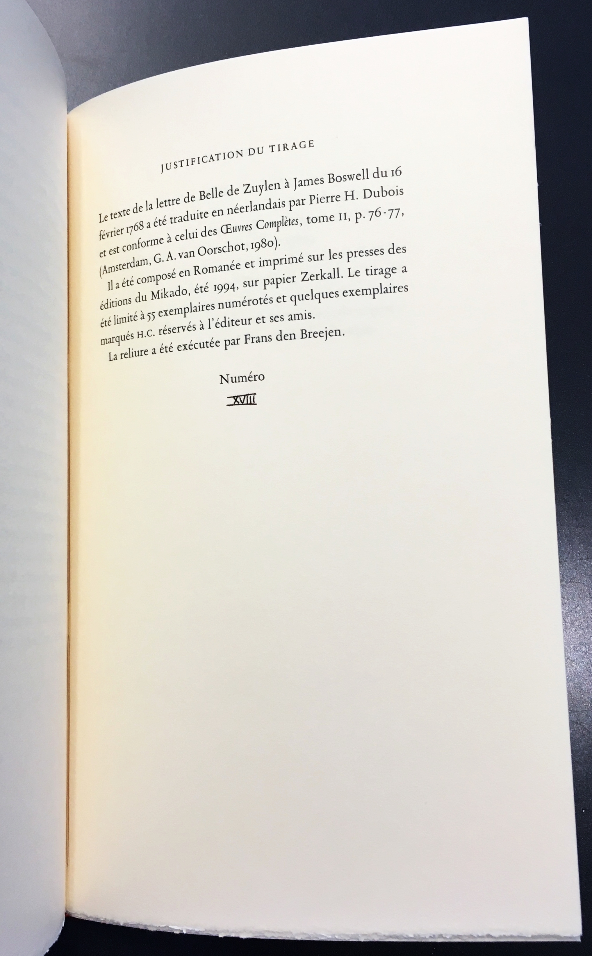 * Eén van de 26 Romeins genummerde luxe-exemplaren in een zeer verfijnde band van Frans den Breejen. Deze door de drukker ontworpen en uitgevoerde band heeft een halfleren rug en kartonnen platten, waarin in reliëf het portret van Van Zuylen is gedrukt. Tweetalige uitgave (de Nederlandse vertaling is van Pierre H. Dubois).