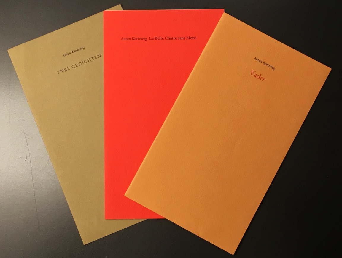 5 B. KORTEWEG, Anton Collectie van 3 jaarwisselingsgeschenken. Den Haag, Mikado pers, 1985-2001. Vouwbladen in omslag. Met de hand gezet en gedrukt in een oplage van 90 exemplaren. 1e druk.