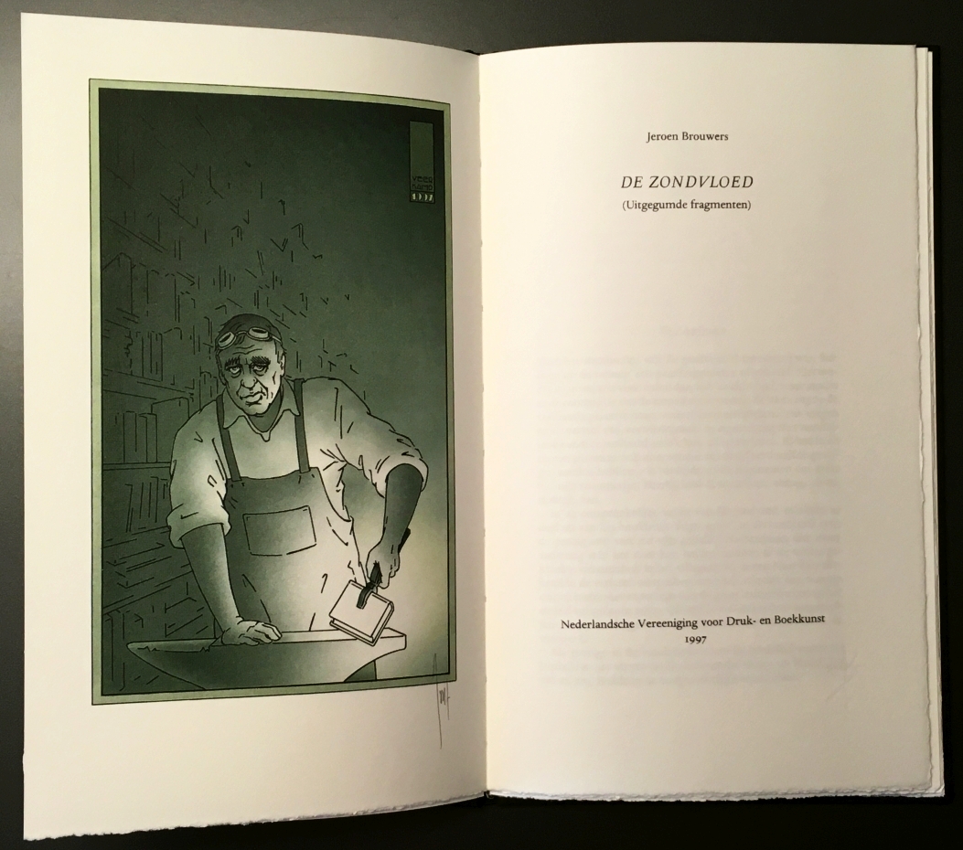 9. BROUWERS, Jeroen De zondvloed. (Uitgegumde fragmenten). (Met een gesigneerde zeefdruk en vignetten van Joost Veerkamp). Zonder plaats, Nederlandsche Vereeniging voor Druk- en Boekkunst, 1997. Linnen. (24) p. Gezet uit de Dante en gedrukt op Zerkall in een oplage van 220 door auteur en illustrator gesigneerde exemplaren. 1e druk.