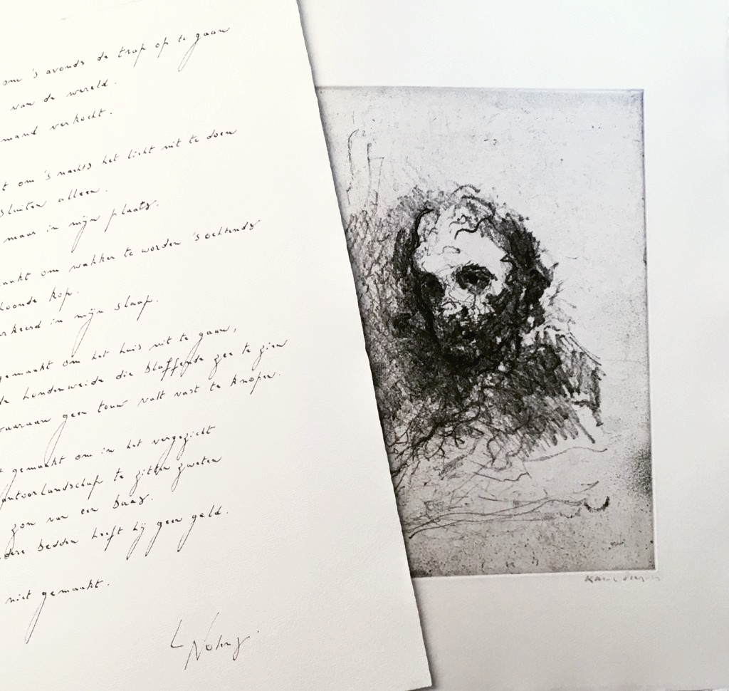 22. NOLENS, Leonard Negen slapeloze gedichten. Etsen Karel Dierickx. Gent-Antwerpen, Ergo Pers-De Slegte, (2007). 35 x 27 cm. Ingenaaid met een omslag van bruin Ingres-papier. Met 5 etsen van Karel Dierickx. Gezet uit de Stempel Trump Mediaeval en gedrukt in 69 genummerde exemplaren op papier van Hahnemühle, alle voorzien van een suite van de etsen en een pagina handschrift. Met een Duitse vertaling van de gedichten door Ard Posthuma. 1e druk. Mooi.