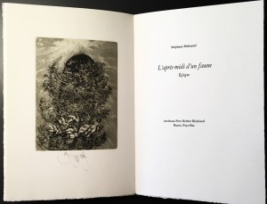 3. (ARETHUSA PERS). MALLARMÉ, Stéphane L’après-midi d’un faune. Églogue. (Met twee gesigneerde etsen van Albin Brunovsky). Baarn, Arethusa Pers, (1985). Verguld groen halfmarokijn met marokijnen voorrand (Binderij Phoenix). (24) p. Gedrukt door Vincent Loosjes in een oplage van 110 genummerde exemplaren.